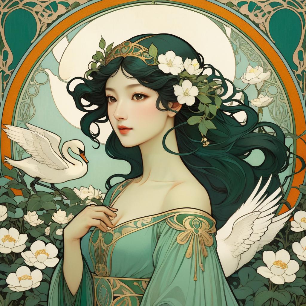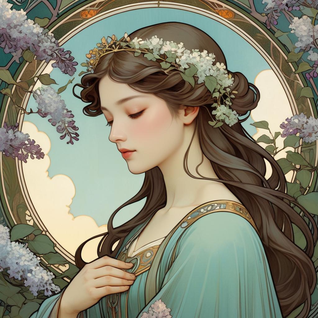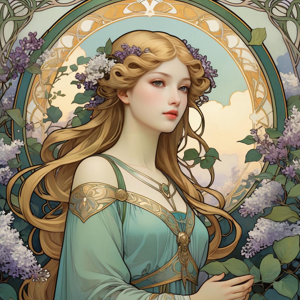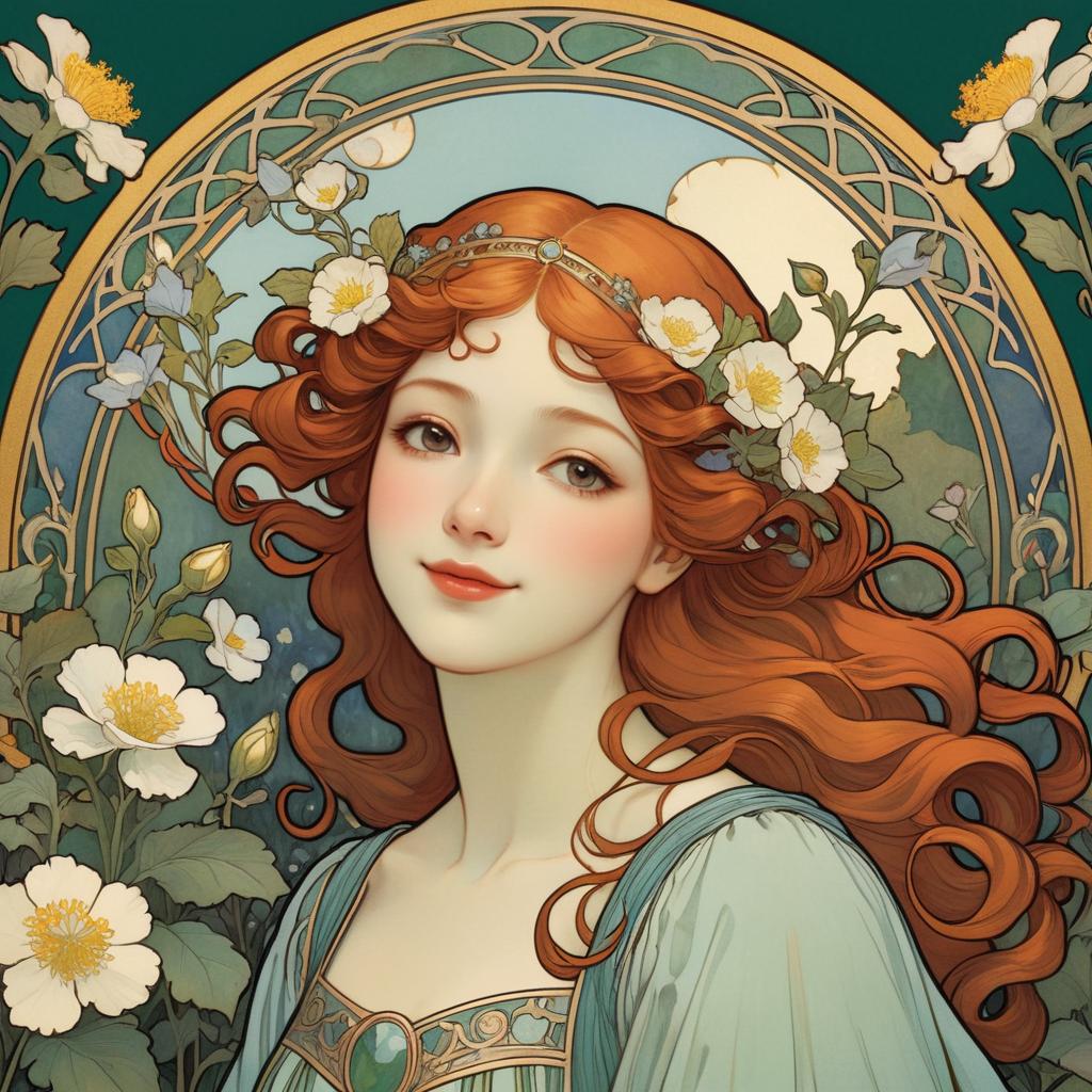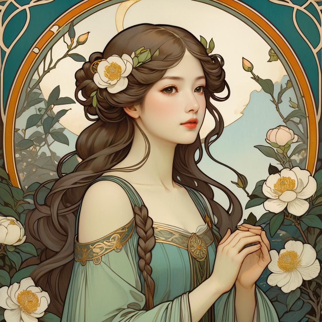 An Art Nouveau style illustration of a graceful woman standing in a vibrant poppy garden. She wears a flowing teal gown with golden intricate patterns and has short, curly black hair adorned with red poppy flowers. A golden halo surrounds her head, enhancing the sacred, serene atmosphere. The background features a soft yellow sky with whimsical botanical details and orange poppies scattered around.