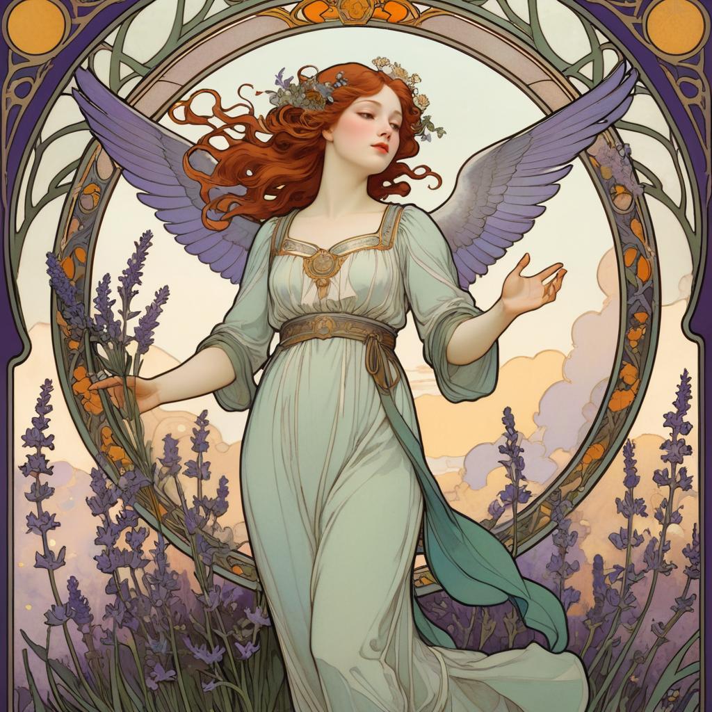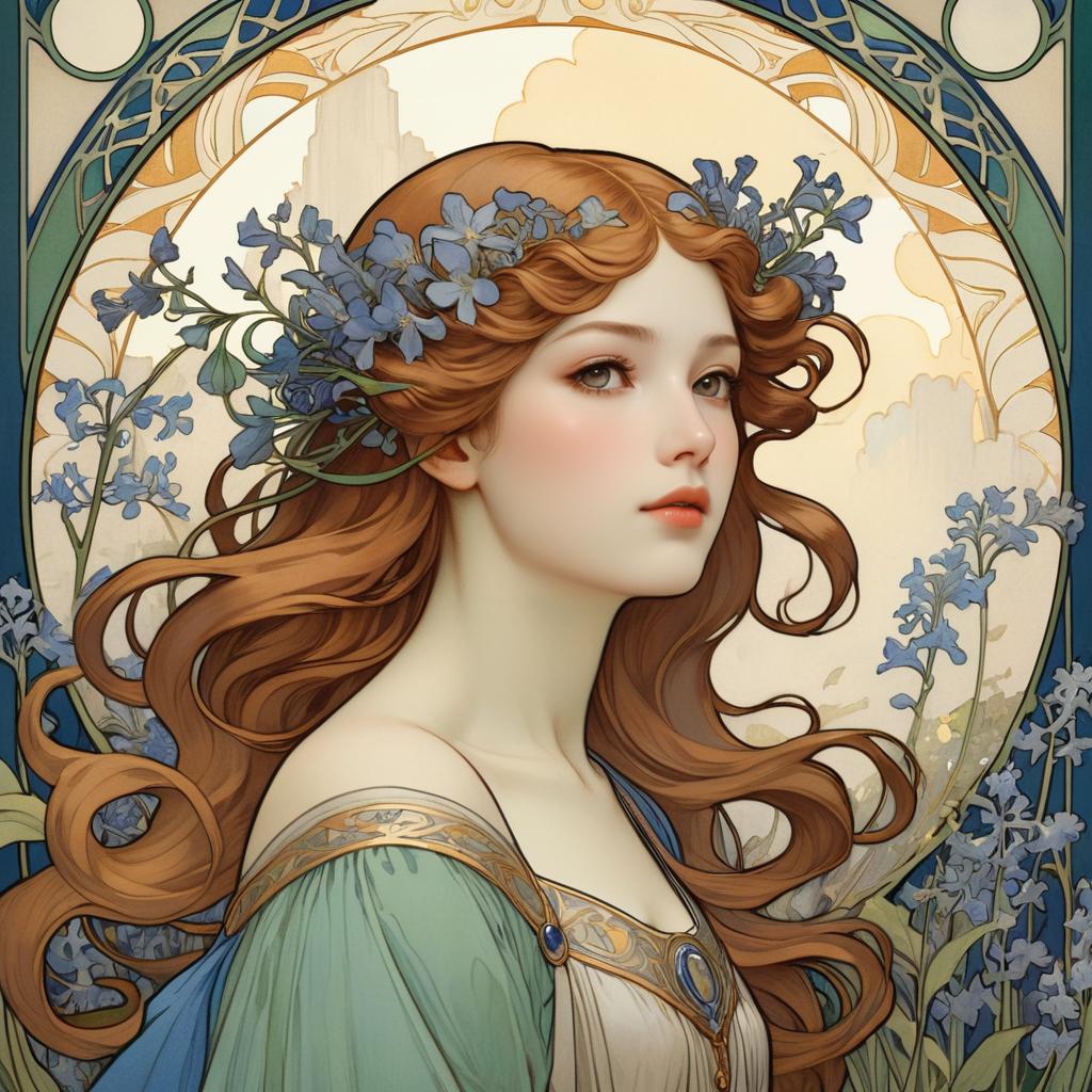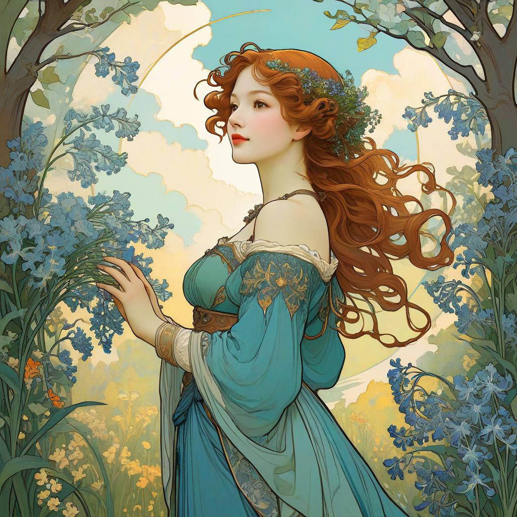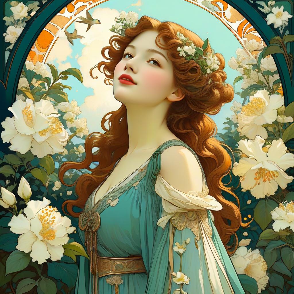 An Art Nouveau illustration in the style of Alphonse Mucha, depicting a joyful full-body woman standing gracefully in a garden of poppies, admiring the blooms with a soft smile. She has short, curly black hair and expressive features with soft lips and open periwinkle eyes. A golden halo surrounds her head, adding a sacred aura. The sky is dotted with larks flying freely above in a serene blue sky. The artwork is rendered with thick lines and intricate botanical details, featuring a harmonious color palette of green, orange, and yellow, drawing inspiration from nature