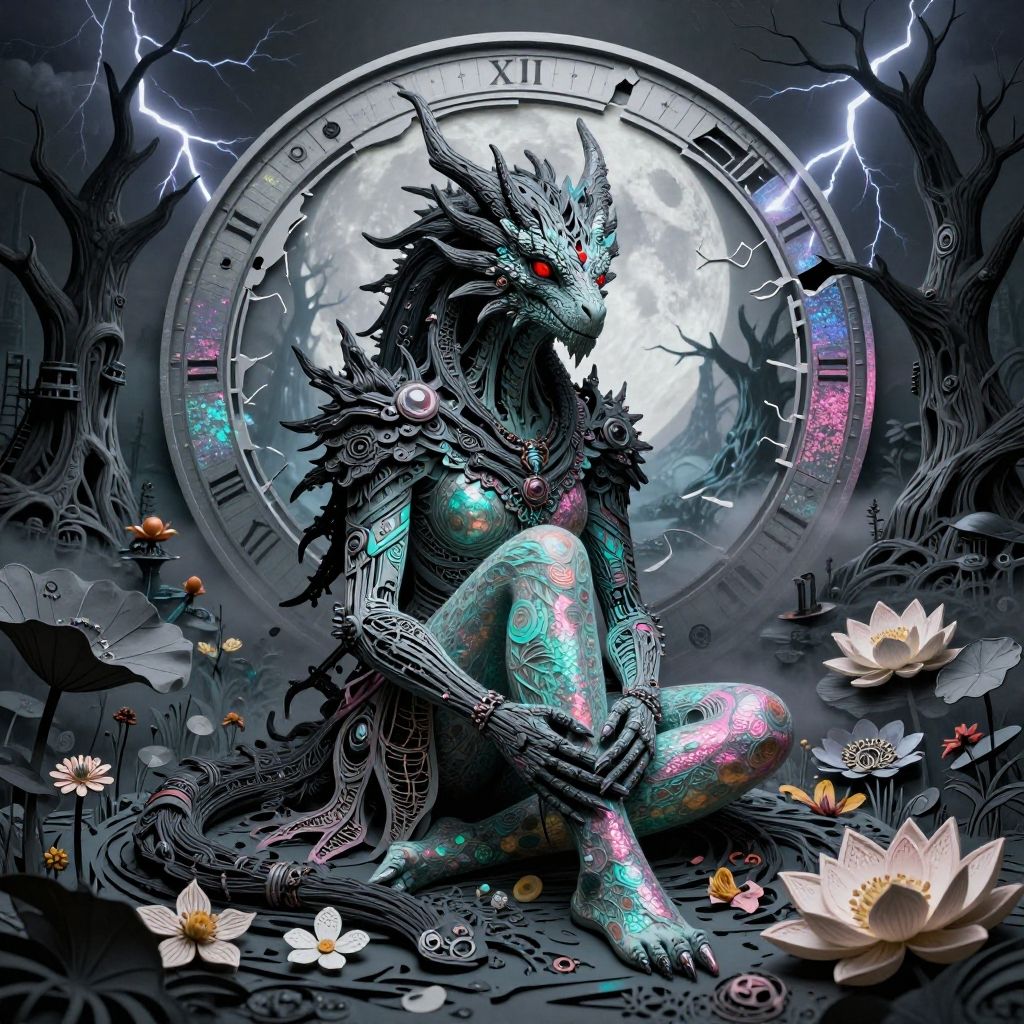 32k hires best quality professional photograph, Dark sci-fi coloured flowery swamp, alien planet, lightning, storm, mystical moon, tattooed biomechanical mutated Mystical Beast, dragon red eyes, black wood lace, broken circular time merged a colapsed linear time, Indigo mist, pile of wilted flowers, glassmorphism pattern, death tree, lotus, Black and White night, industrial elements, opl, __raw_colors__, adorned in Thomas Barbey-inspired attire, soft Aquamarine and Pink shimmer reflection, biomechanical nanobot, egg yolk-gloss, pointillism, Mysterioussitting with hands around her anklesstacked papercut art of . 3D, layered, dimensional, depth, precision cut, stacked layers, papercut, high contrastSydney Edmunds, natural, shimmering, vibrant, gothic, rpg, 1400ad, ultra detailed, detailed, immersive, reminiscent of high fantasy RPG games, HD, masterpiece, best quality, hyper detailed, super realistic, perfect face, perfect hands, award-winning, professional, breathtaking