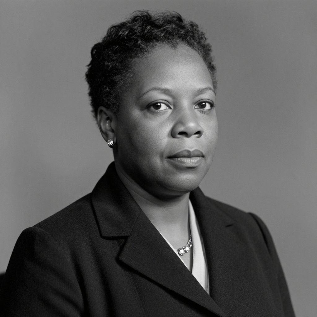 Black-and-white portrait of a serious, attractive, dark-skinned Black woman with short curly hair, wearing a dark blazer and necklace, looking slightly