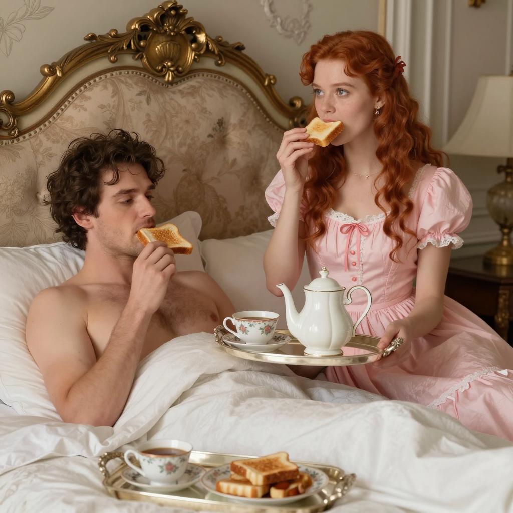 Man with dark hair, shirtless, reclines in ornate bed with white pillows, eating toast. Red-haired woman in pink dress with puffed sleeves holds a silver tray with a teapot. Bed has gold, decorative headboard. Trays with food and tea set in foreground. Woman's expression is focused. Two people. Romantic, vintage setting.