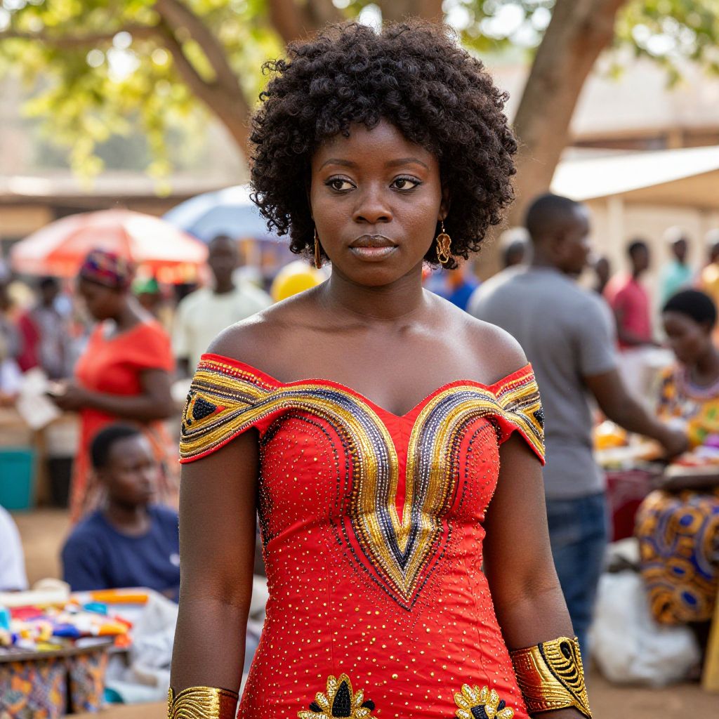 Photograph of a young Black woman with dark skin and natural curly hair, standing outdoors at a market. She wears a vibrant red, off-the-shoulder dress adorned with gold and black beaded patterns forming a heart shape on the chest. Her dress is embellished with small, sparkling sequins. She also wears matching gold bracelets. The background is blurred but shows several people, some wearing colorful clothes, and market stalls with various items. Sunlight filters through trees, casting dappled light. The setting is lively and bustling.