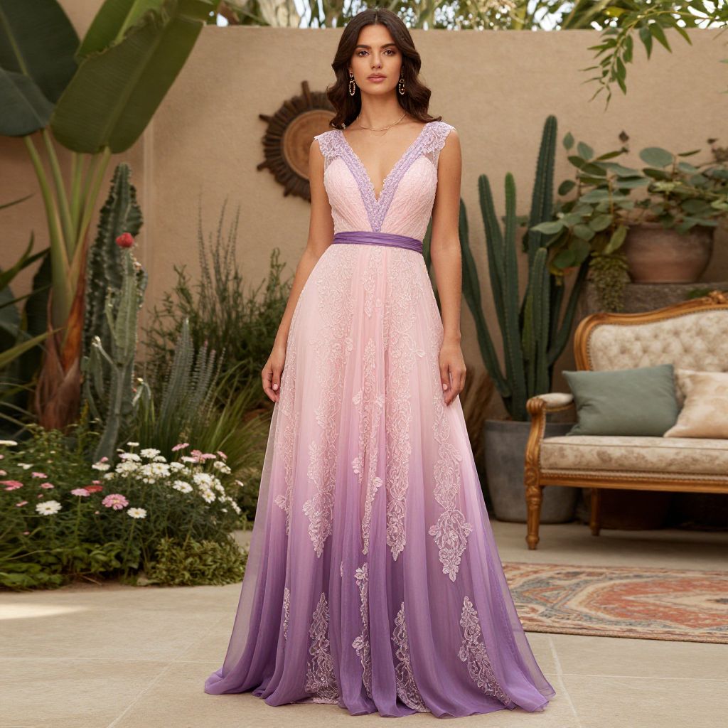 Photograph of a woman with dark hair in a deep V-neck, lavender-to-pink lace gown, standing in an outdoor courtyard with wicker furniture