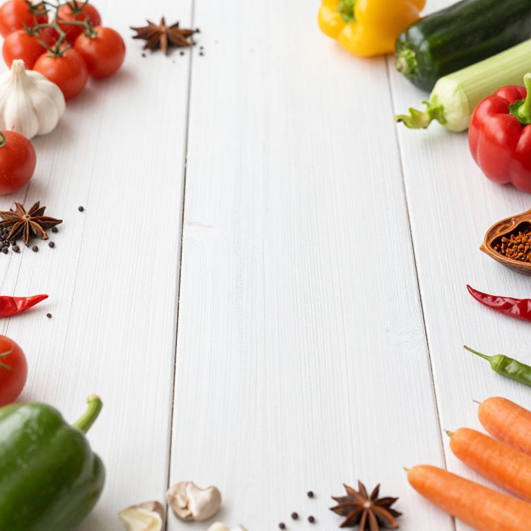Healing bright table in perspective with scattered vegetables and spices around an empty space in the center, realism style,
