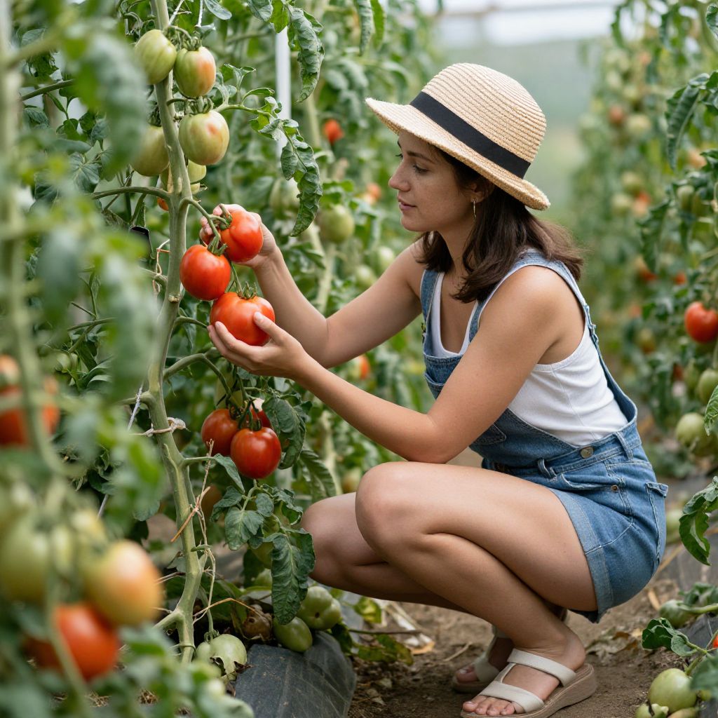 Woman crouching amidst lush green tomato plants, carefully selecting ripe red tomatoes in her vibrant vegetable garden.