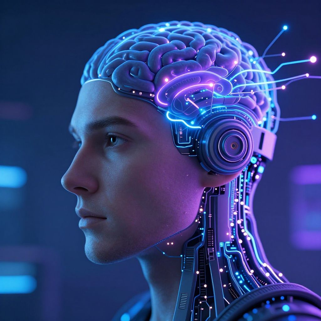 Futuristic neurolink device embedded in human head, sci-fi cybernetic neural interface with light pulses flowing through nano-circuits, modern cyberpunk aesthetic, blue and purple neon glow, ultra detailed face and brain area, high-tech immersive environment