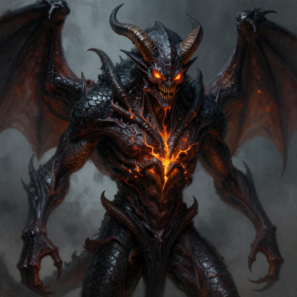 Draw a Abyssal fiend with obsidian skin with ember-like fissures with an original appearance, but with distorted and sinister details. Its features should evoke the darkness and chaos of the Abyss: flaming eyes, twisted claws, dark skin with scales, and perhaps even membranous wings or curved horns. The image should be in Digital Art style with a quality similar to gouache painting, characterized by strong contrasts between light and shadow. The textures should give an impression of depth and richness, akin to those of a traditional painting.