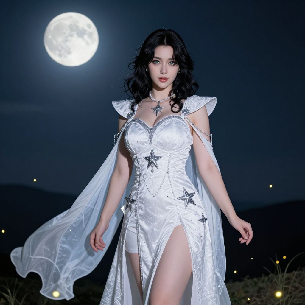 A charismatic young woman with wavy black hair, sharp green eyes, and a confident expression dressed in a fantasy-themed female fancy dress costume — a moon goddess outfit with a long white gown, silver embroidery, star-shaped patches, and a flowing cloak — standing atop a moonlit hill at night, with a full moon shining above and soft fireflies drifting around her.. The woman has big tits and cute face