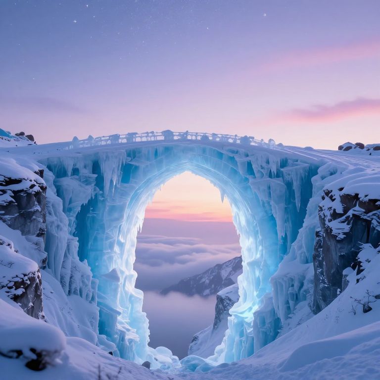A mesmerizing digital artwork depicts a luminous, ice-covered archway bridging two snow-capped cliffs, illuminated by the ethereal glow of a twilight sky adorned with stars and soft pastel hues, evoking a dreamlike, otherworldly dimension.