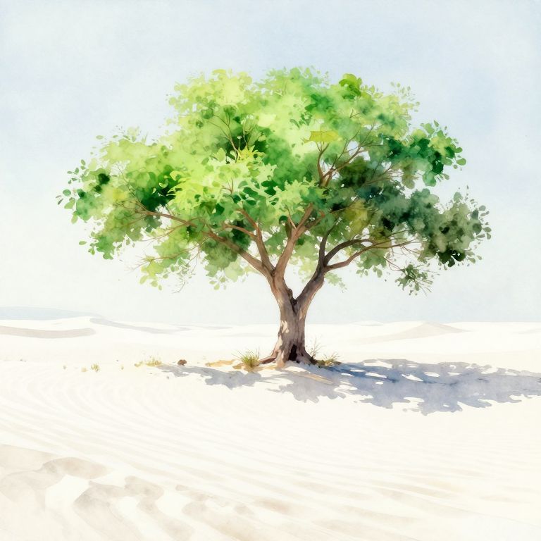 Craft an impressionistic watercolor scene depicting a solitary grand tree with luminous green foliage standing against a boundless sea of stark white desert dunes, radiating a vibrant emerald glow that gradually dissipates into the distance. The artwork should invoke a sense of awe and intrigue through its shifting colors and delicate brushstrokes, offering an immersive visual narrative that contrasts life and desolation to inspire contemplation on nature's endurance and the hidden beauty within harsh landscapes.