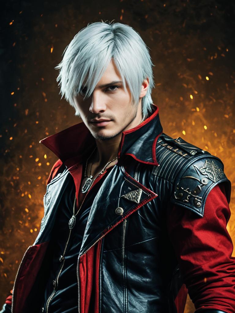 Man cosplay. Wearing Nero (Devil May Cry) costume. Realistic photo. Dressed as Nero (Devil May Cry) --sref 1389