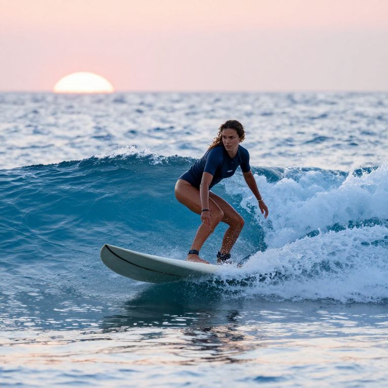 Determined Female Surfer Riding Morning Wave