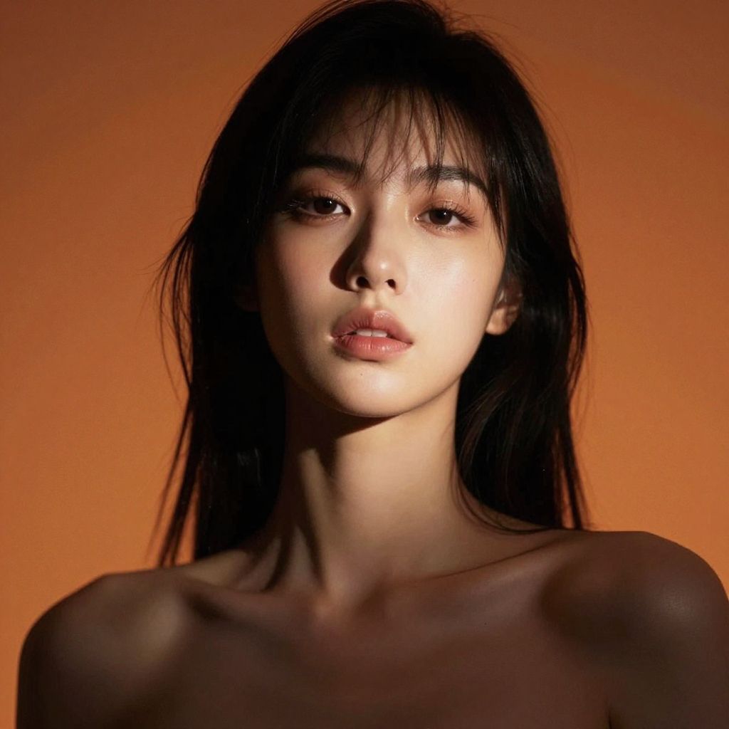 Spotlight, 1girl, upper body, dark theme, looking at viewer, parted lips, orange background, beautiful detailed skin