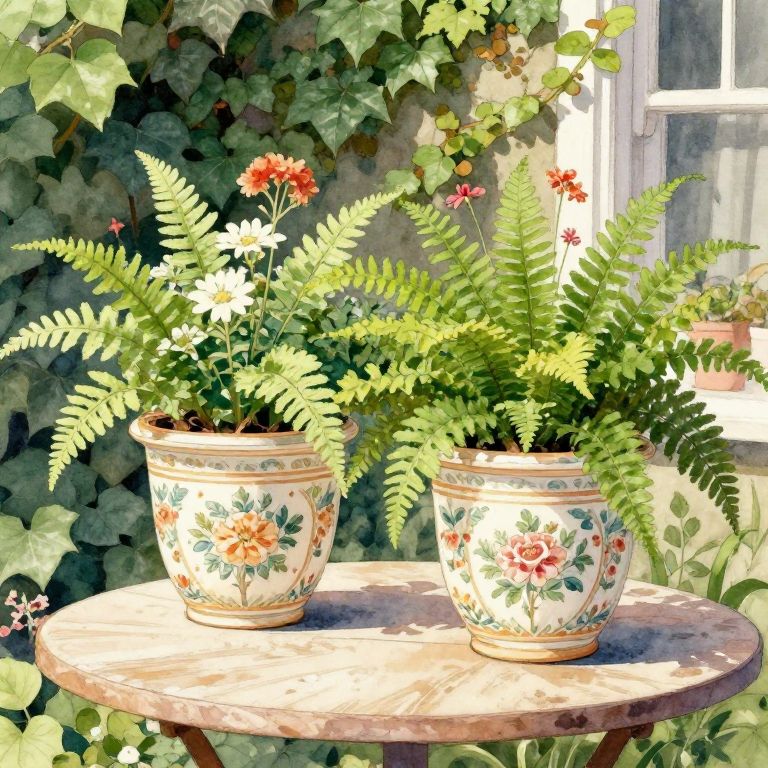 Vintage ceramic planters with intricate floral patterns overflowing with vibrant ferns and seasonal blooms, placed on a cozy garden table against a backdrop of ivy-covered walls, soft natural daylight, watercolor painting style.