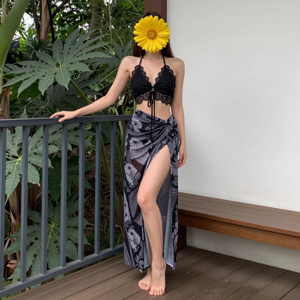 Photograph of a young woman with a yellow flower covering her face, standing on a wooden deck. She wears a black lace-up halter top and a long, patterned skirt with a high slit on her right leg. Her left leg is bent at the knee, foot on the deck. She is barefoot, right arm resting on a metal railing. A wooden bench is to her right. Background includes a white screen and lush greenery.