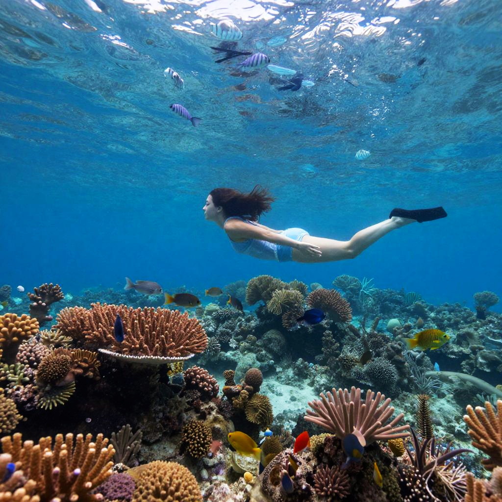 Goingmary serene underwater world, GoingMary depicted as a graceful figure swimming among colorful coral reefs and exotic marine life, soft diffused light filtering through clear water, peaceful and vibrant oceanic scene