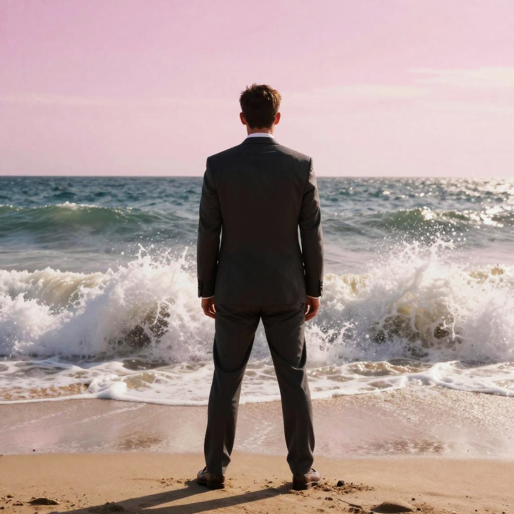 Realistic photo.A photorealistic image of a man in a suit, standing with his back to crashing waves on a beach, dramatic lighting, cinematic pink sky, backlit by the sun. Hyper-realistic, 8K resolution, short hair, and vibrant tones realistic photo