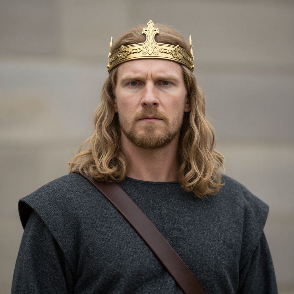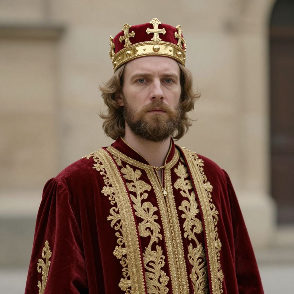 A photograph of a serious-looking, bearded man with long, wavy blonde hair wearing a golden crown with red jewels. He's dressed in a rich, red velvet robe with gold trim and holds a sword in his right hand. The background is a stone building, giving a medieval, regal vibe. The man's expression is stern, and the lighting is natural.