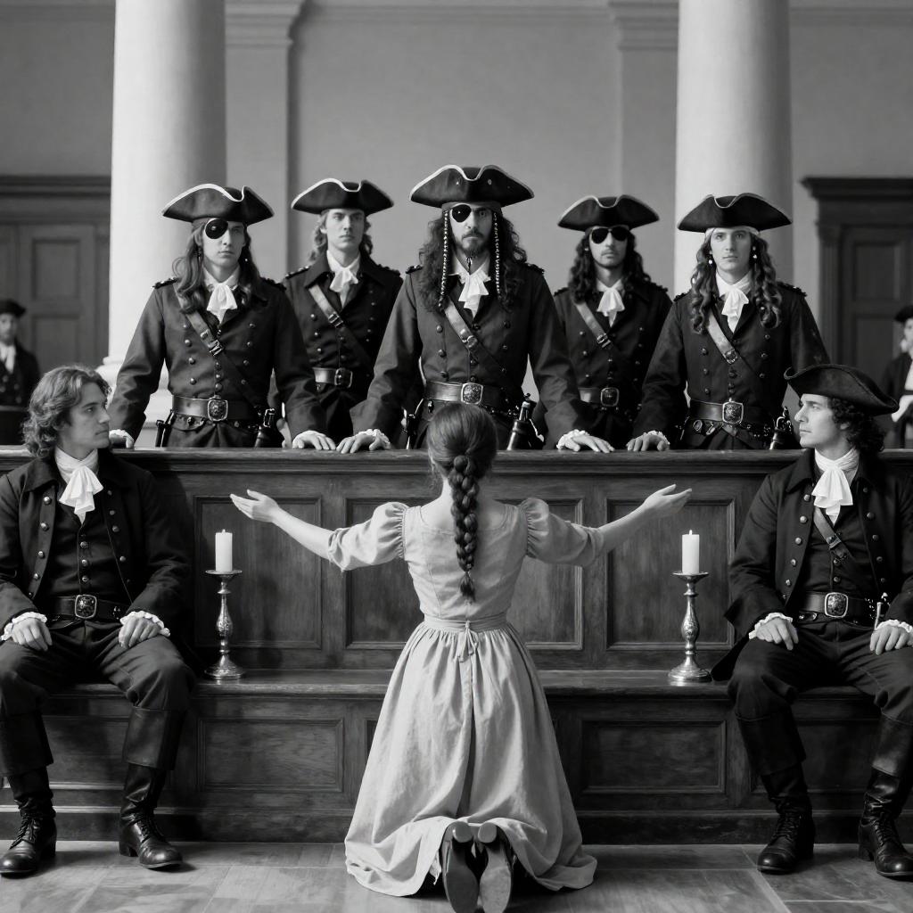 Black-and-white photograph of a courtroom scene. Six uniformed pirates with tricorn hats and eye patches stand and lean on a wooden bench, surrounding a kneeling woman in a long, light-colored dress. Several men in 18th-century clothing sit and stand to the sides. Candlesticks are on the bench. The woman's arms are stretched out in front of her. The background features large columns. The pirates' expressions are stern.