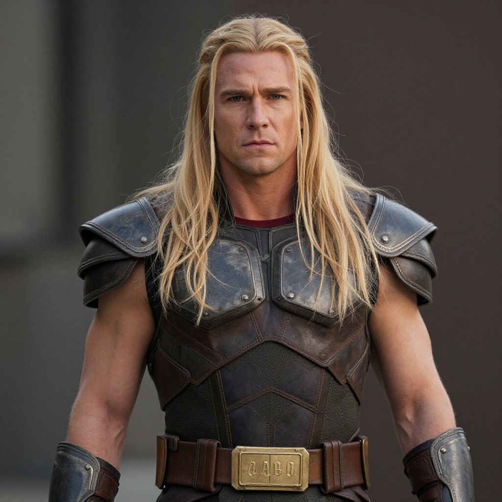 Photograph of a muscular, blonde-haired man with long hair, wearing black, armored chest plate, brown belt with gold buckle, serious expression, dark