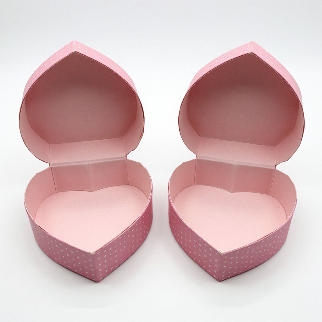 Two heart-shaped favor boxes, crafted from pink paper with a delicate polka-dot pattern, are displayed open and closed side by side, showcasing their elegant design and interior lining.