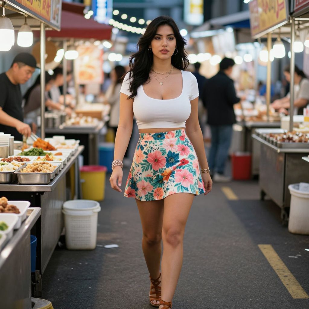 A voluptuous woman in a modern casual outfit, wearing a white fitted crop top and a floral print high-waist skater skirt in shades of pink, blue, and green, strolls through a vibrant dim sum night market in Seoul. She has layered delicate gold necklaces and multiple bracelets on one wrist, complemented by brown cut-out wedge sandals. The scene captures her delight as she samples delicious street food, surrounded by colorful stalls and twinkling lights, all rendered in the visual style of Gottfried Helnwein. Sexy. Pretty face and beаutiful eyes. Big breasts