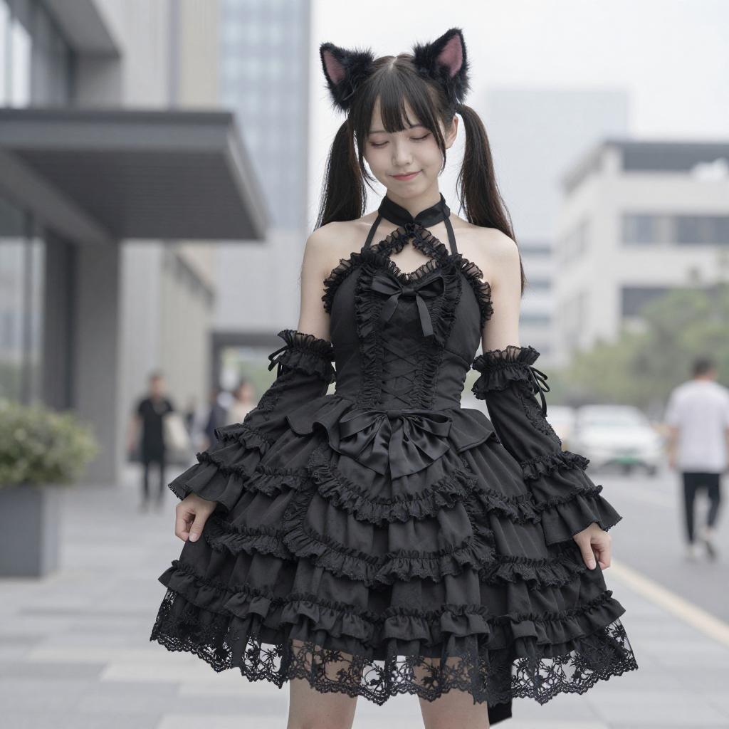 1girl, masterclass, best quality, outdoors, city, smile, smug, twintails, animal_ear_fluff, gothic_lolita, lolita_fashion, halter dress, cat ears, cat_girl, long dress, halterneck, layered dress, frilled dress, center_frills, detached sleeves, ShionGothic, closed mouth, standing