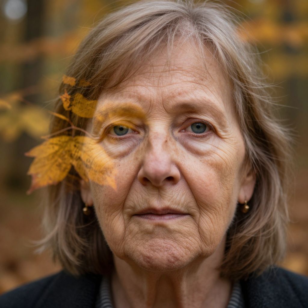 An elderly woman with weathered skin and piercing blue eyes, exuding wisdom yet tinged with melancholy, graces this portrait photograph. Overlaid upon her visage is a soft-focus autumn forest scene—golden leaves softly caressing her face as if time itself were swirling in the gentle breeze. Her hair blends seamlessly with the rich foliage hues, creating an intimate harmony between nature and human existence. This double exposure effect, captured close-up, evokes profound introspection on the fleeting beauty of both season and life.