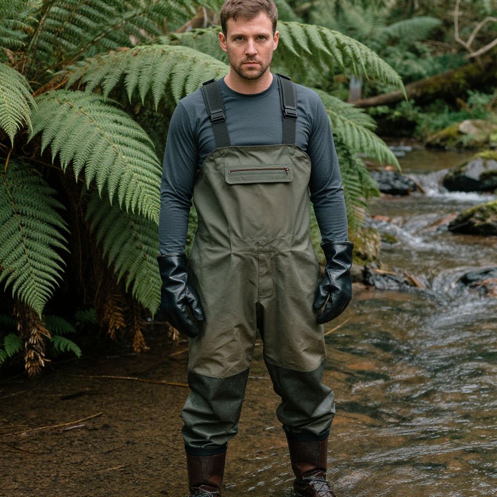 A man, lightweight breathable waders, olive green nylon, waterproof gloves, dark gray long-sleeve moisture-wicking shirt, sturdy brown hiking boots, standing in a lush ferns, babbling brook, oversaturated film style, focused expression. Man has masculine face and piercing eyes