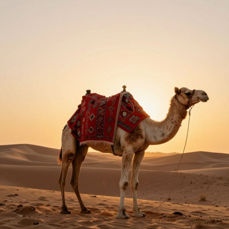 A serene desert camel adorned with a vibrant red, patterned fabric draped over its back stands gracefully against the golden hues of a setting sun, evoking a tranquil and poetic atmosphere reminiscent of traditional Middle Eastern artistry.