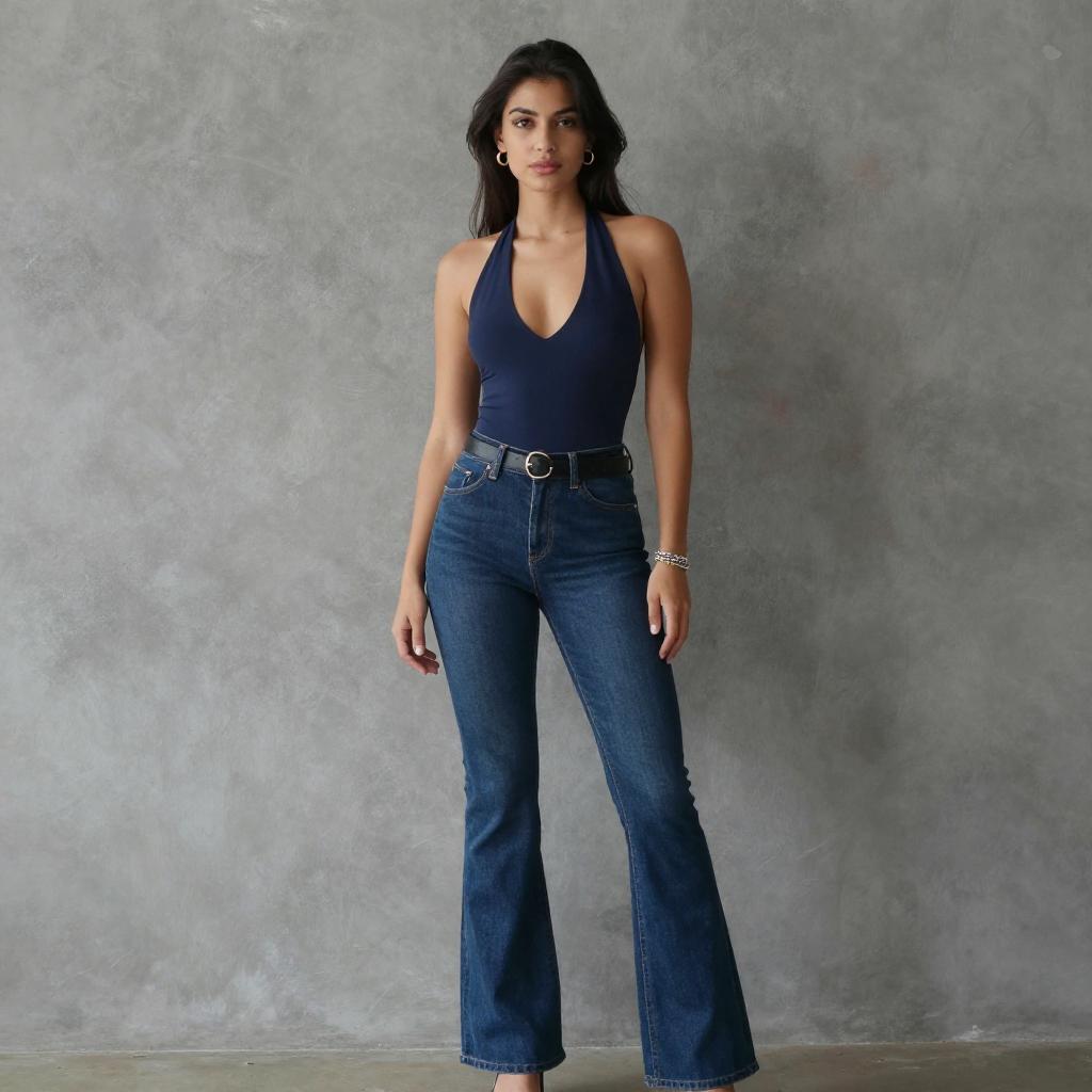 Full-length portrait of a confident young woman with long dark hair wearing a navy blue halter top paired with dark blue flared jeans. She accessorizes with a black belt, silver hoop earrings, and a silver bracelet. The woman stands against a neutral grey textured wall with a calm and neutral expression, showcasing modern casual fashion.