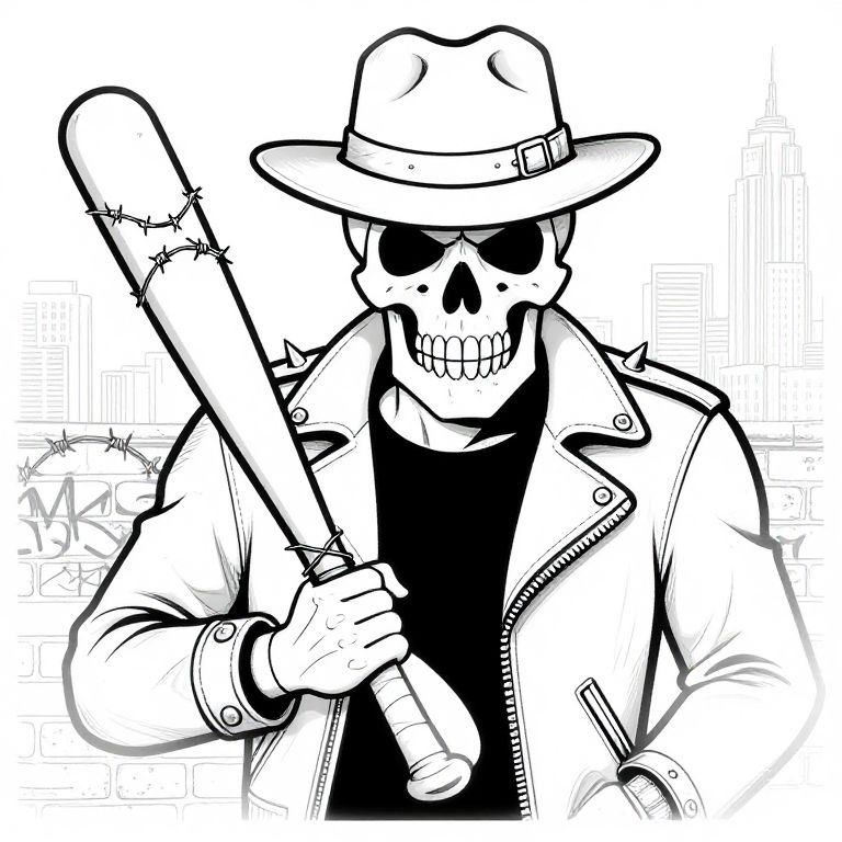 Gangster skull coloring pages capturing an urban outlaw skull in a leather jacket with spikes, holding a baseball bat wrapped in barbed wire, set in front of a graffiti-covered brick wall and cityscape, high contrast line drawing for coloring.