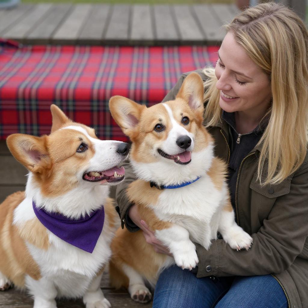 Photograph of a woman with blonde hair and a brown jacket, holding a small tan and white corgi with a blue collar, while another corgi with a purple scarf leans in, both looking at her. Wooden deck with red plaid blanket in background. Woman smiling, corgis with happy expressions. Two people, two dogs.