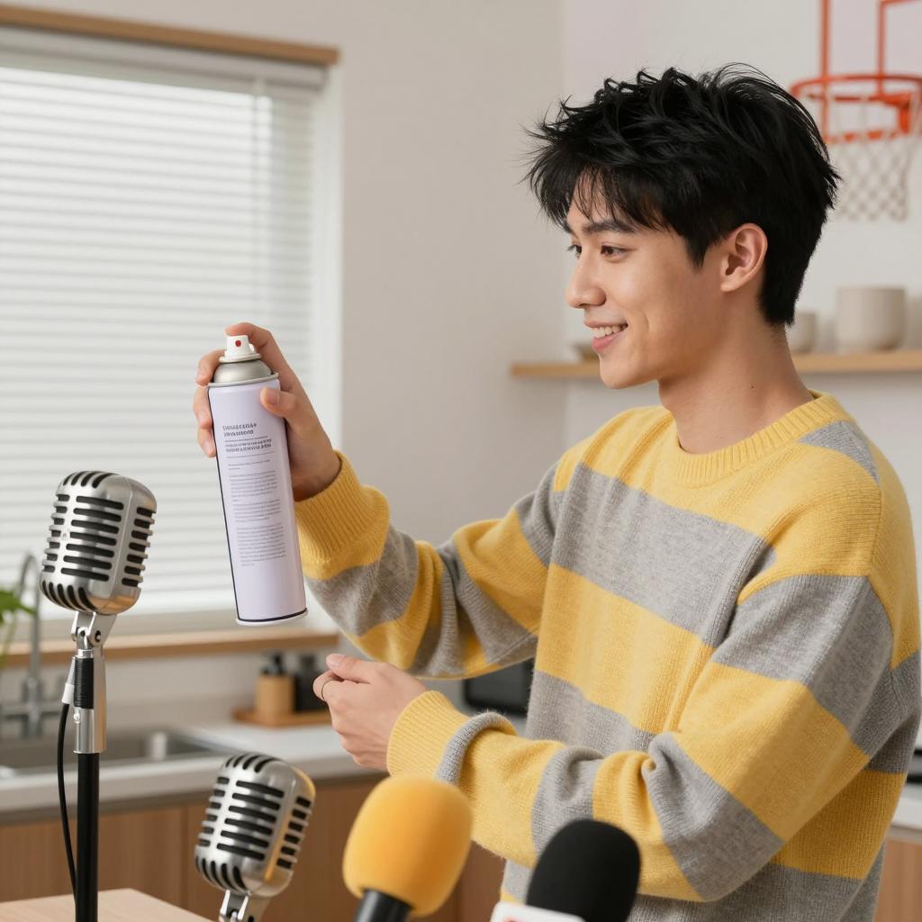 Man watering garden with hose in right hand. Wearing dark sunglasses, beige shirt, light gray tank top, beige pants. Short dark hair. Standing on green lawn. White house in background with lattice, bushes, flowers, and white garden fountain on right. Sunlight filtering through trees. Daytime.