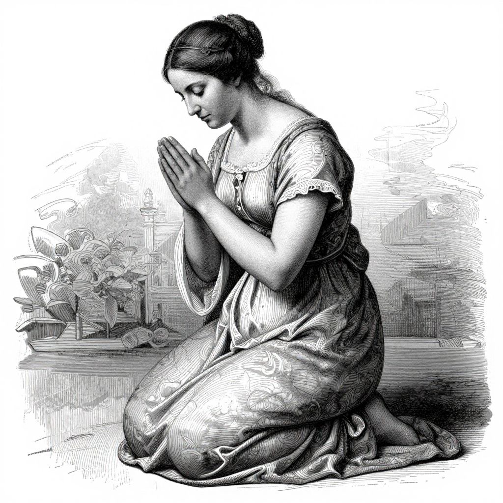 A detailed black-and-white drawing depicts a woman kneeling in prayer, her hands clasped together in a gesture of devotion, rendered in a vintage style reminiscent of classical portraiture, with intricate shading and texture that evoke the timeless elegance of historical art.