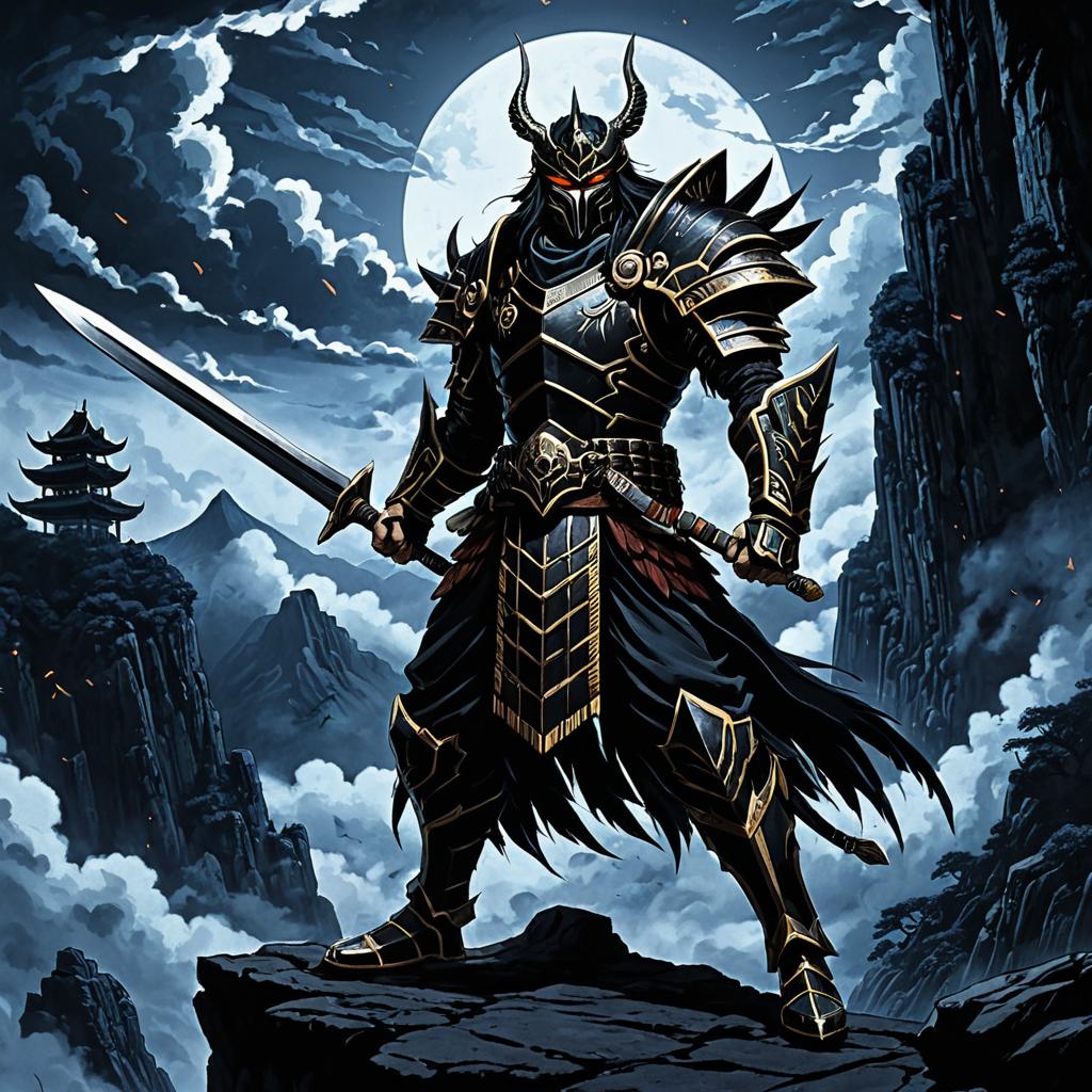 Illustration of a stealthy roc warrior wearing midnight black armor adorned with gold accents, featuring sharp angular plates and a horned helmet with glowing amber eyes. The warrior stands confidently on a rocky cliff with a detailed sword, overlooking an ancient multi-tiered temple among thick clouds under a large moonlit sky, showcasing a dark and intense anime style inspired by Go Nagai.