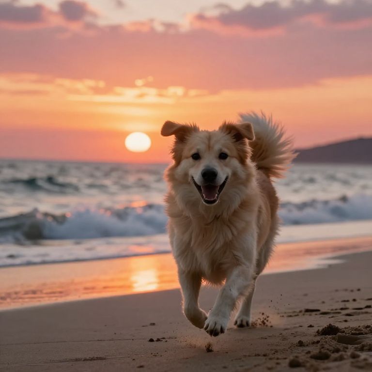 Photograph of a golden-furred dog with a fluffy tail and white paws running joyfully on a sandy beach during sunset. The dog's mouth is open, showing its teeth, and its ears are perked up. The sun is low on the horizon, casting a vibrant orange and pink glow across the sky and reflecting off the waves in the background. The ocean has gentle waves, and the sand has visible footprints. The dog's fur contrasts with the colorful sky, adding a sense of warmth and excitement to the scene.