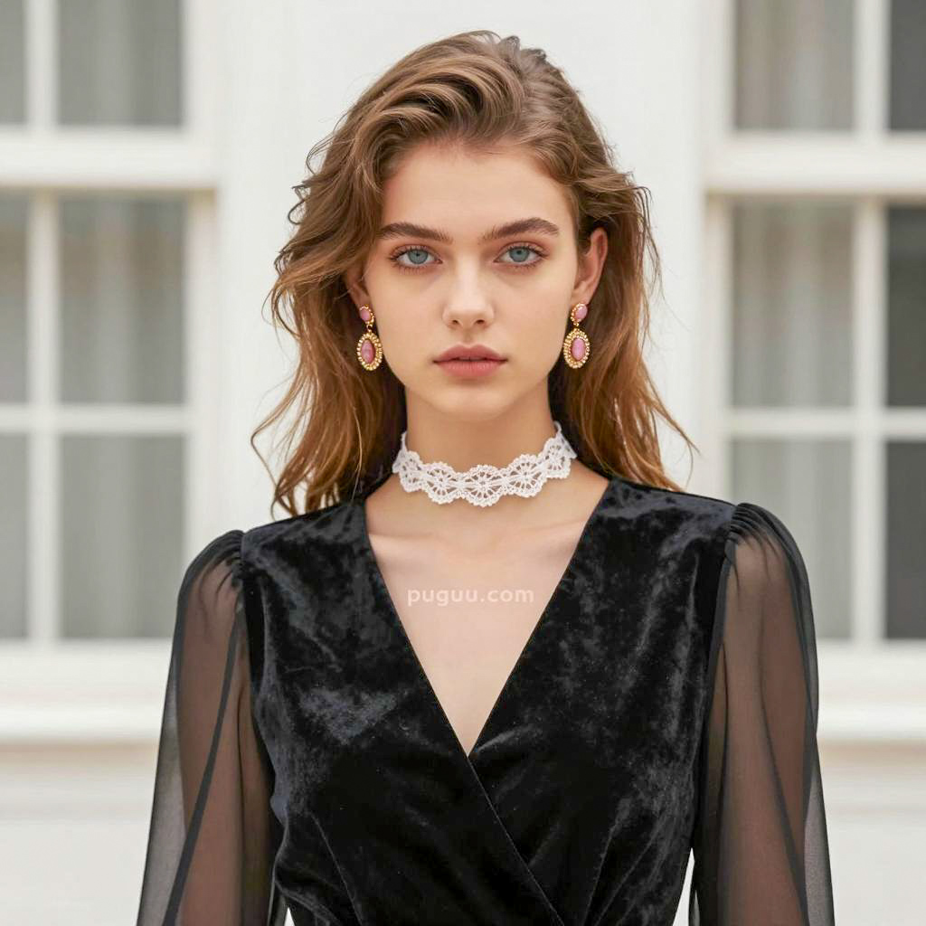 Photograph of a young woman with light skin, blue eyes, and wavy brown hair. She wears a black velvet V-neck dress with sheer sleeves and a white lace choker. Her earrings are gold with pink gemstones. She looks directly at the camera with a neutral expression. The background is blurred with white windows. The "puguu.com" is across her neck.