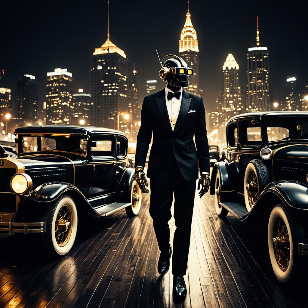 A cyberpunk robot jazz musician in suits, set against a 1920s city skyline with vintage cars, polished brass and glossy ebony wood, illuminated by soft warm stage lights.