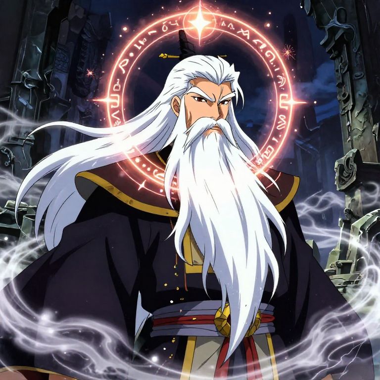 Buff old man anime master meditating in a serene bamboo forest, powerful muscles barely hidden under loose clothing, long beard and fierce eyes, mystical energy swirling around him, morning mist and soft sunlight filtering through leaves, detailed anime art.