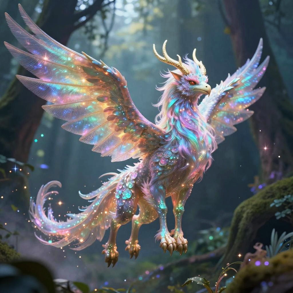 Radiant dreamlike hummingbird fused with an opal snow leopard adorned with prismatic feather coats shedding spectral dust, drifting in a dreamlike surreal landscape, soft volumetric lighting, 8K resolution, trending on ArtStation, hyper-detailed Unreal Engine render, by James Jean. ar 9:16