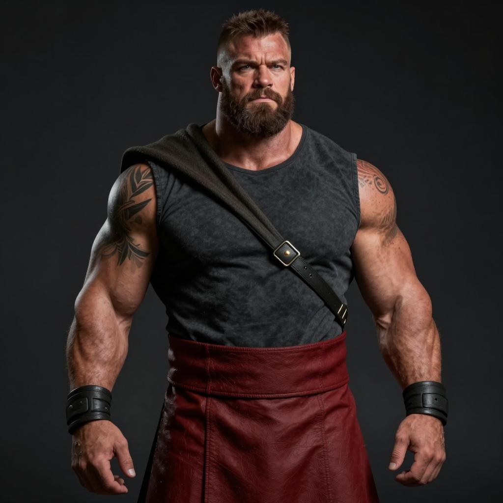 Photorealistic image of a muscular man with a beard and short brown hair wearing a dark gray sleeveless shirt and a red leather skirt. He has tattoos on his left arm, black wristbands, and a dark fabric strap draped over one shoulder. The man stands against a dark background with a serious, focused expression. Dim, dramatic lighting and a shadowed backdrop enhance the moody, cinematic atmosphere.