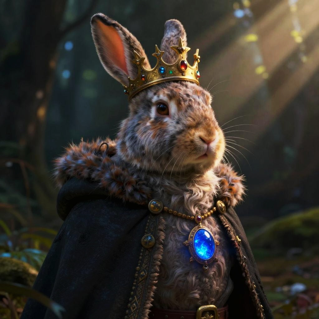 Photorealistic CGI of a regal rabbit with a gold crown and blue gemmed necklace, wearing a dark fur-trimmed cloak, in a