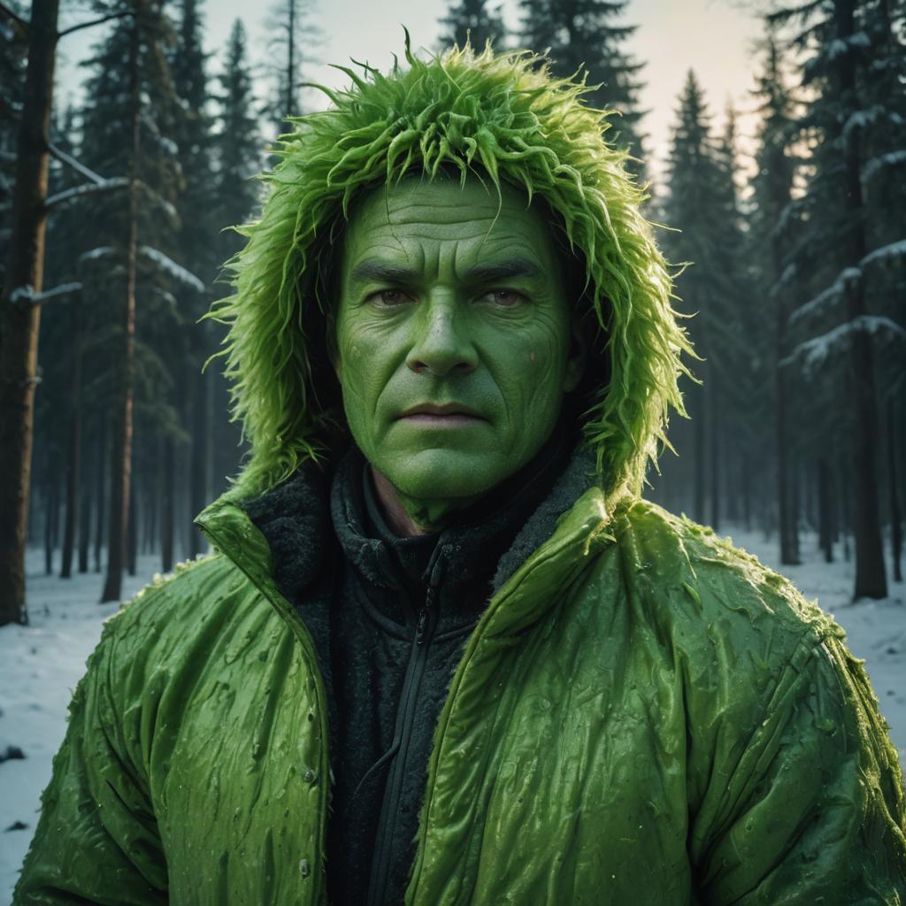 Man in a shiny, almost slimy green creature suit, close-up to medium shot. He has a full green prosthetic face with defined scowl lines, prominent white eyebrows, and a confused, bewildered expression. He is wearing a shaggy, bright lime green faux fur hooded coat with a pointed top. The background is an enchanted forest under a starlit sky. Cinematic lighting, photorealistic, 8k, high detail, winter atmosphere.
