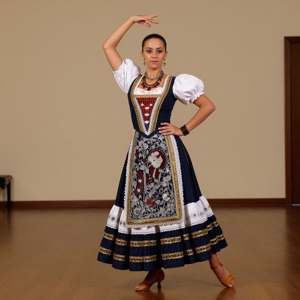 Traditional italian dance, solo, dress, 1girl, jewelry, black hair, necklace, standing, high heels, full body, bracelet, looking at viewer, indoors, puffy sleeves