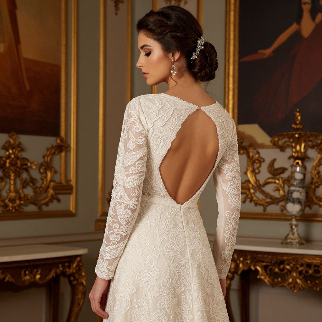 Elegant thread-embroidered gown featuring gathered long sleeves, an open back, and delicate lace detailing, worn by a woman with her hair styled in a sophisticated updo adorned with sparkling accessories, set against the backdrop of ornate interior walls with framed artwork.