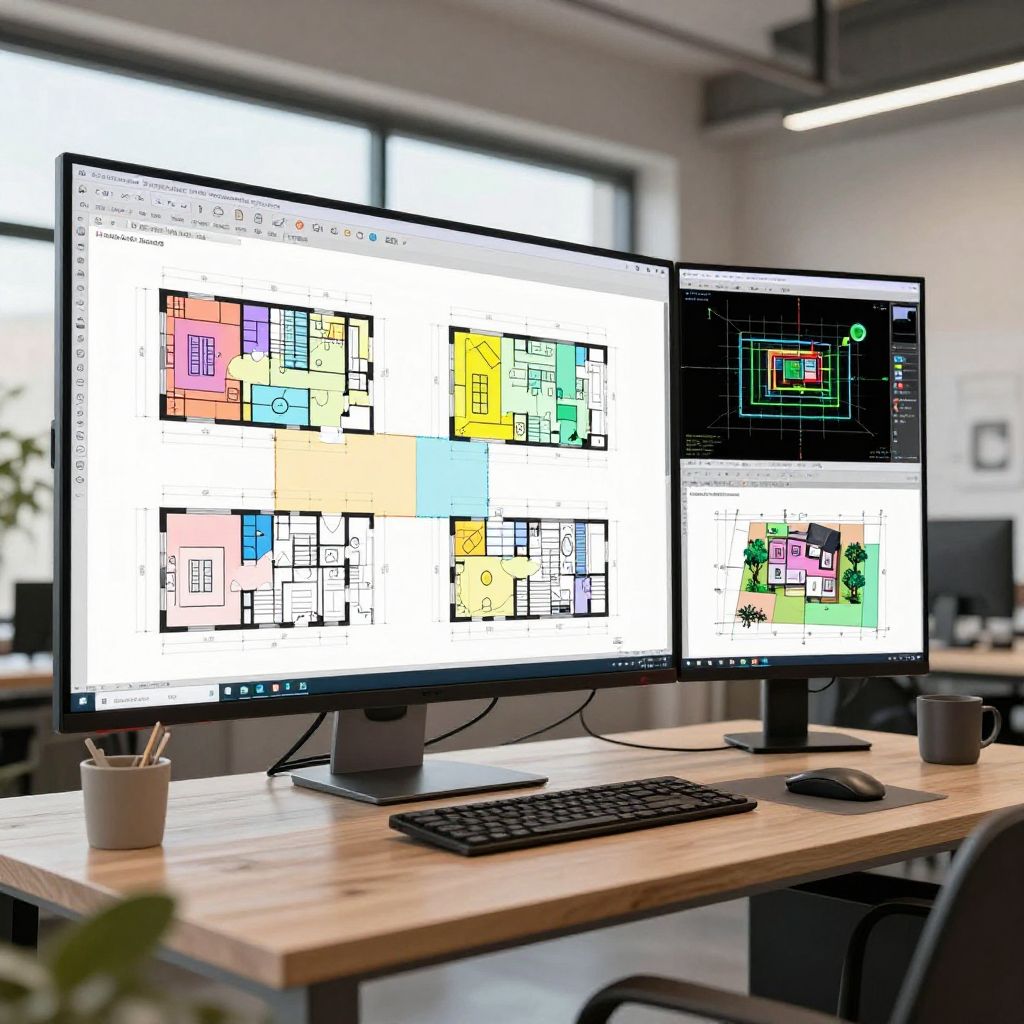 Floor plan generator visualization showcasing an architectural studio with multiple screens displaying editable blueprints, vibrant colors, detailed CAD drawings, natural light illuminating the space, professional creative environment, 4K realism