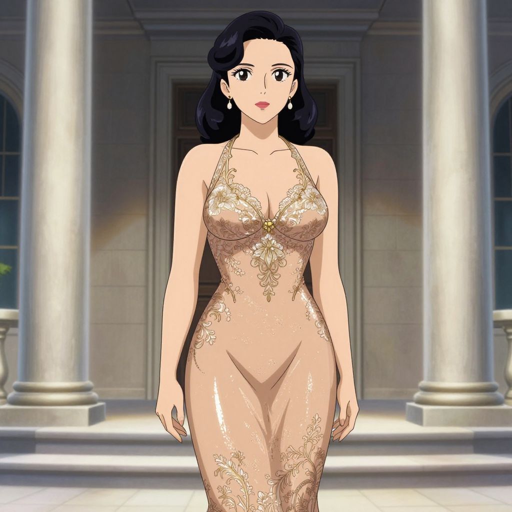 This is a digital anime-style drawing of a fair-skinned woman with black, wavy hair, standing in front of an elegant, classical building with tall white columns. She wears a sheer, nude-colored gown adorned with intricate gold floral patterns that reveal her medium-sized breasts and curvy figure. Her expression is neutral, with slightly parted red lips and large, dark eyes. The background features a dimly lit doorway and large windows, creating a luxurious, sophisticated atmosphere. The lighting emphasizes the sheen of her dress and the smoothness of her skin.