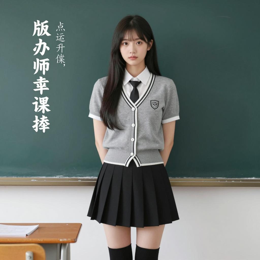 Asian woman with long black hair, wearing a gray school uniform with white trim and black pleated skirt, black thigh-high socks, standing in front of a green chalkboard. Hands behind back, neutral expression, chalkboard in background, desk partially visible. Text overlay on left side.