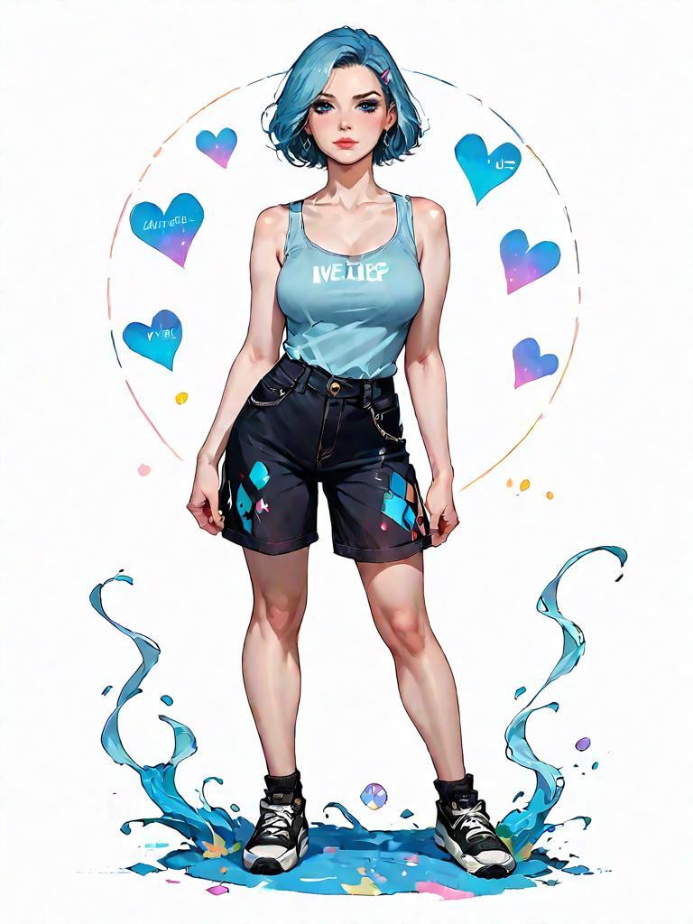 Digital artwork of a young woman with blue hair wearing a summer casual blue and white gingham two-piece set. The outfit includes a crop top with thin straps and a ruffled hem, paired with high-waisted shorts featuring a self-tie belt. She wears white sandals and has a white scrunchie. The image has a realistic face and full body shot with a white background and a pastel circular design behind her.